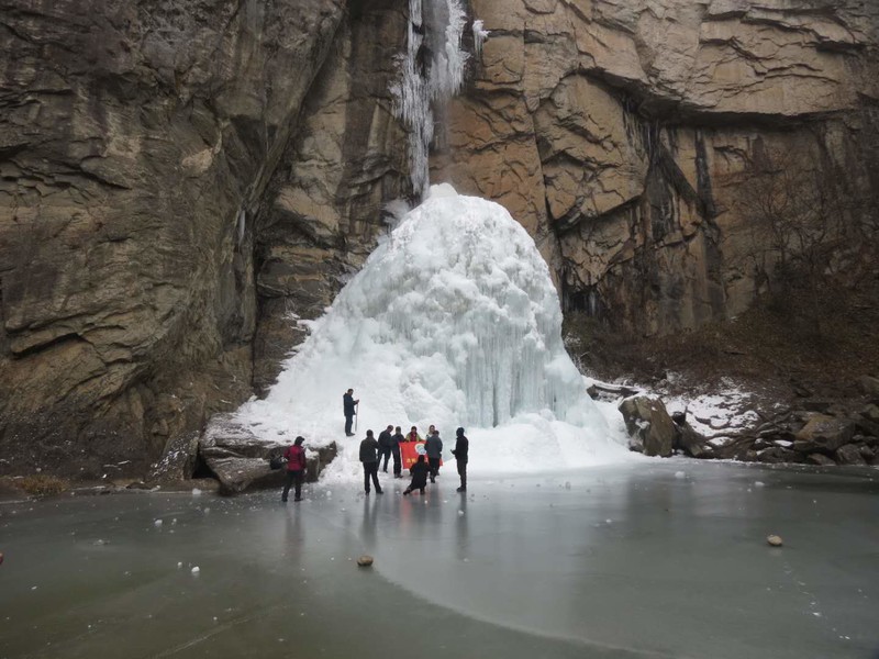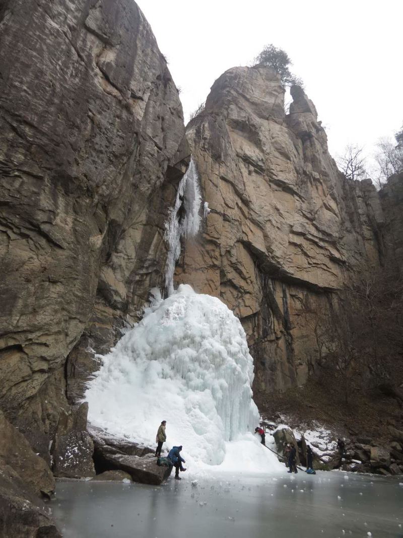 挂钩瀑这个地方,只有少数玩户外的老驴知道,它 挂钩瀑这个地方,只有少数玩户外的老驴知道,一般的人们根本不知道有这个地方,它位于南召县马市坪乡焦园村的一处深山中。如果没有当地向导带路,很难走到那里。 2019年1月6日,南阳377户外在山鸡的组织下,20名喜爱户外的驴友来到山里,准备一睹挂钩瀑的冰挂奇观。车直接开到当地向导家的门前,稍事休息,便从向导家屋后开始上山,一直拔高到1千多米高度,人们暂停休息,接着是往谷底走,途中穿密林,过草地,经过几个小时的翻山越岭,终于来到了今天的目的地一挂钩瀑。