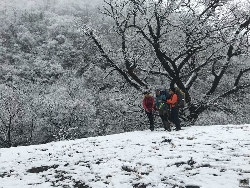 天梯上去后我最后一个上去后,发现大家都在前面不走了。原来前方的路全部被积雪覆盖,大约是个5米高,70度的小斜坡。以前的路走一个z字,但是积雪覆盖,滑的落不下去脚。尝试了几次,完全不行,也没任何东西借助。