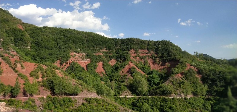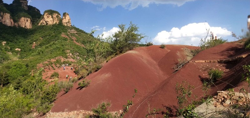 炽热红砂岭 坐车坐了一路,一直搞不清楚晋城到底是哪里。来之前问了度娘,知道是山西省的领地,别的,一概不知。但我知道,我即将到的地方与众不同。 看路线介绍说:晋城红砂岭的丹霞地貌特别明显,因红沙岭丹霞地貌区植被覆盖稀少,红色岩层经风化作用变成红沙,沉积过程中不同颜色的岩层相间分布,形成了“披彩带”“系腰带”的地貌景观。也由此,吸引了户外众多驴友们的偏爱与必须打卡地。这里山脉错落起伏,红沙遍地,特别是雨后的红砂岭,如同燃烧的火焰,将连绵大山“点燃”。我不得不叹服,大自然的鬼斧神工将疆土地域景致挥毫泼墨出各色迥异的丹青画面,更毫不吝啬细微点睛之笔,将大美河山的靓与倩,全部、毫