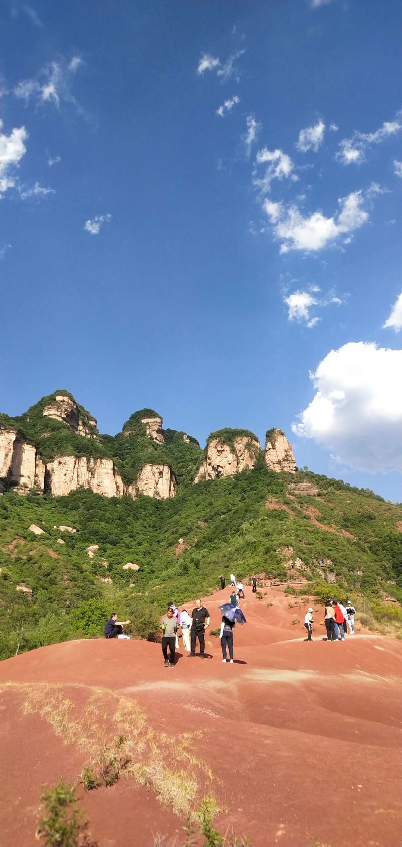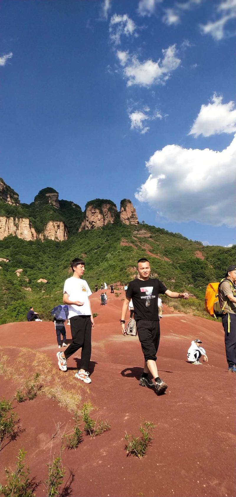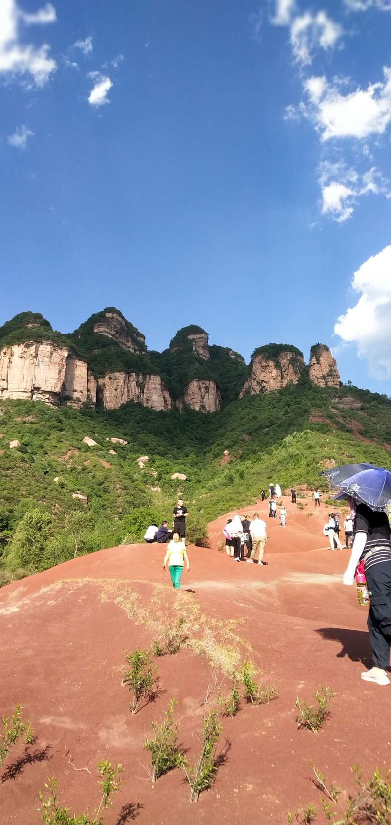 看路线介绍说:晋城红砂岭的丹霞地貌特别明显,因红沙岭丹霞地貌区植被覆盖稀少,红色岩层经风化作用变成红沙,沉积过程中不同颜色的岩层相间分布,形成了“披彩带”“系腰带”的地貌景观。也由此,吸引了户外众多驴友们的偏爱与必须打卡地。这里山脉错落起伏,红沙遍地,特别是雨后的红砂岭,如同燃烧的火焰,将连绵大山“点燃”。我不得不叹服,大自然的鬼斧神工将疆土地域景致挥毫泼墨出各色迥异的丹青画面,更毫不吝啬细微点睛之笔,将大美河山的靓与倩,全部、毫无保留地展现在人间劳苦大众面前。使人在脱离繁琐疲累日常,亲历祖国山水之好后,爱上了这种自由、放松、舒缓压力的一种散漫旅游方式。不得不说,人与自然的和谐共处,才能衍生出更多独属于精神享受方面的愉悦,也还有对于美好生活的向往与追求。